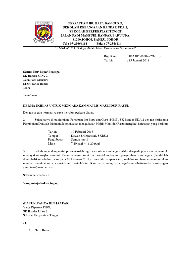 Contoh Surat Rasmi Memohon Sumbangan Wang Surat Rasmi 1 from imgv2-2-f.scribdassets.com Surat somasi pelanggaran serah terima. Surat edaran merupakan salah satu contoh surat resmi yang berfungsi sebagai surat pemberitahuan suatu berita atau informasi secara tertulis dari suatu instansi ataupun organisasi kepada orang banyak/ umum baik di dalam ruang lingkup tertentu atau masyarakat luas serta sifatnya tidak rahasia. Cari hukum mim sukun pada surat al fil ayat1 dan ayat2. Word yang bisa anda download dan ubah seperlunya. Jangan sampai dokumenmu ditolak karena salah buat! Memberi sumbangan sangat dianjurkan oleh siapapun, tuhan pun memerintahkan kita untuk membantu sesama yang tengah dalam kesulitan. For more sumbangan ikhlas dari yb datuk hj abd halim bin jusoh. Contoh surat pemberitahuan untuk berbagai macam acara.